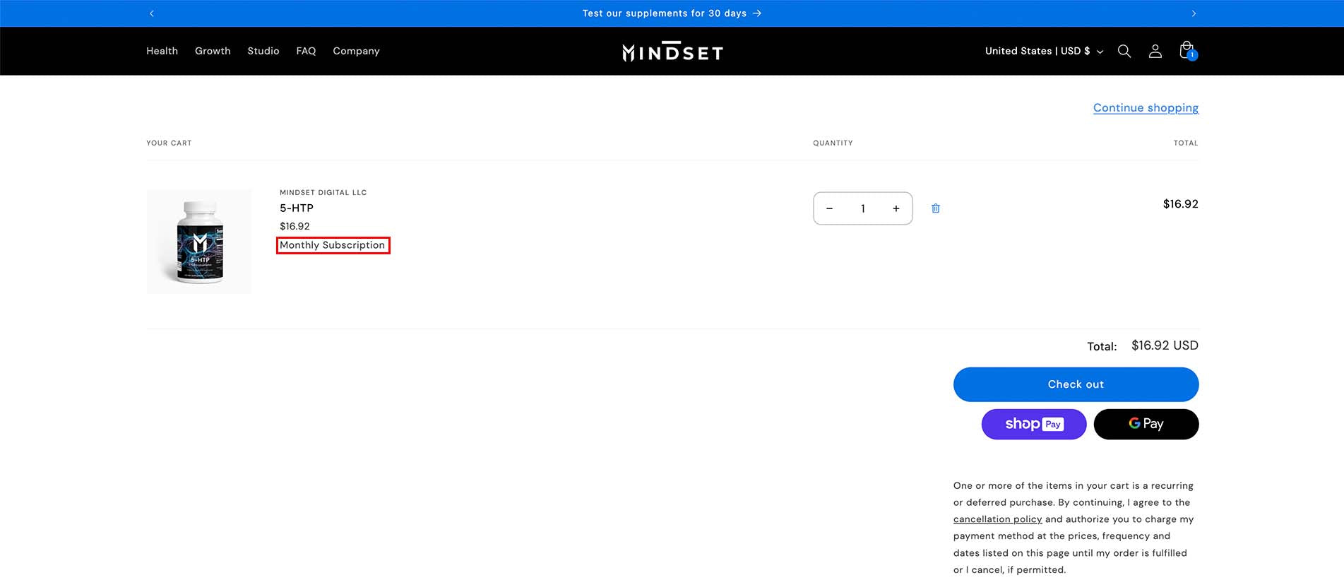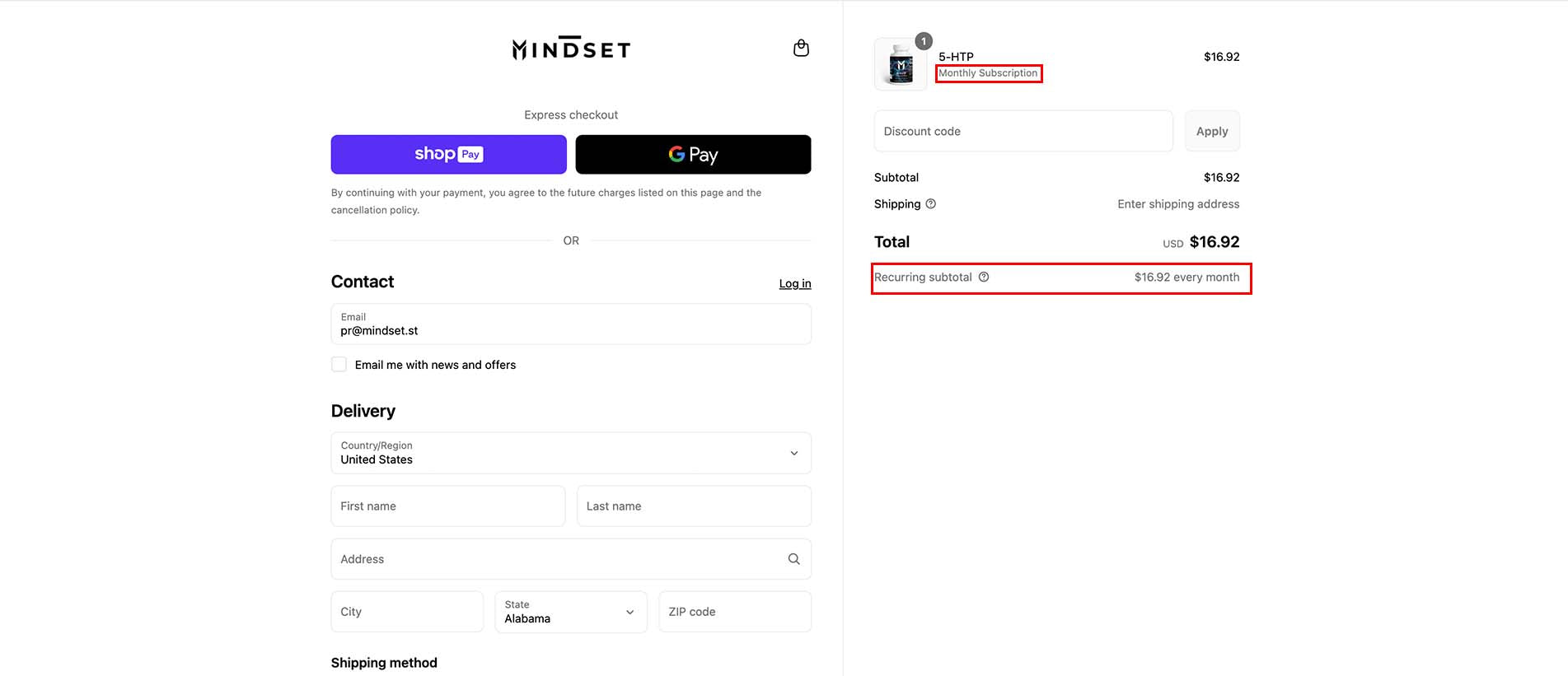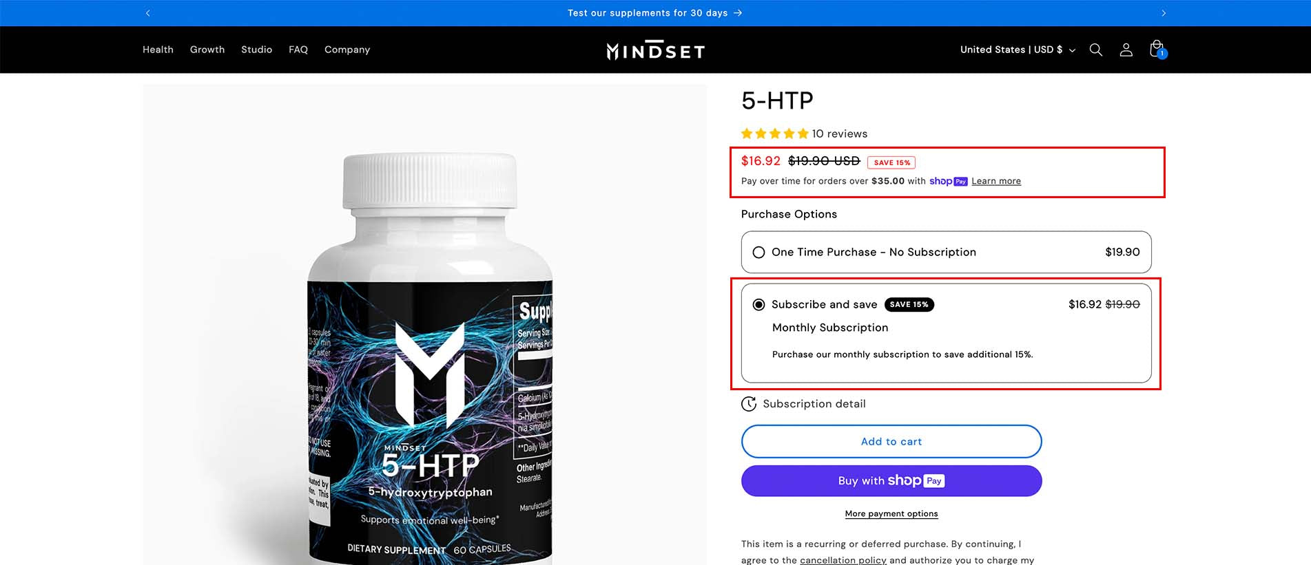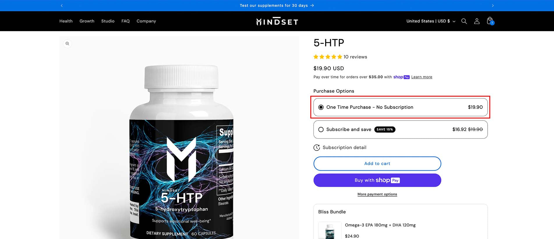 In this example, “One-Time Purchase” is selected. That means you’re making a single, non-recurring purchase with no discount and no future shipments.