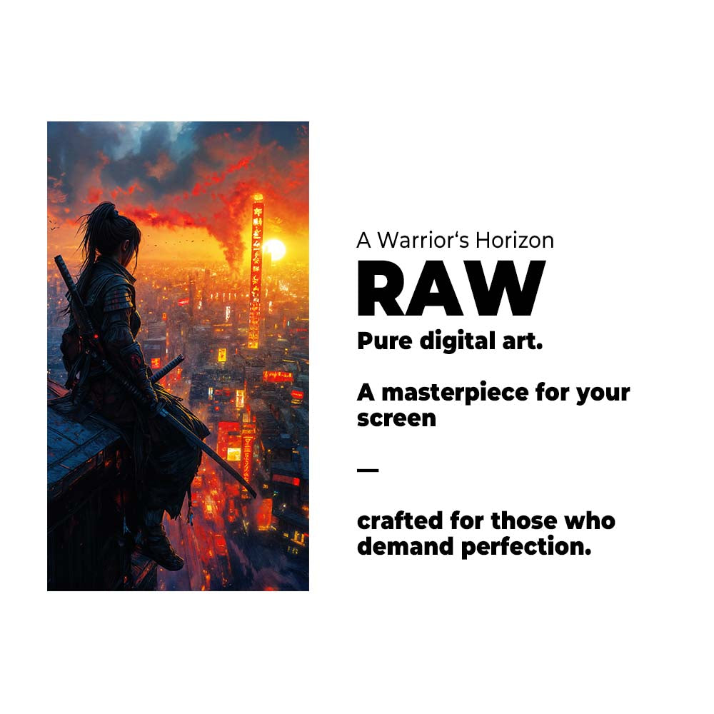 “A Warrior’s Horizon” captures the boundless spirit of resilience and ambition. Perched high above a glowing city drenched in the fiery hues of dusk, the lone warrior surveys the horizon—a landscape alive with chaos and opportunity. The blade at their side symbolizes the readiness to confront challenges, while the serene stance reflects unshakable focus.