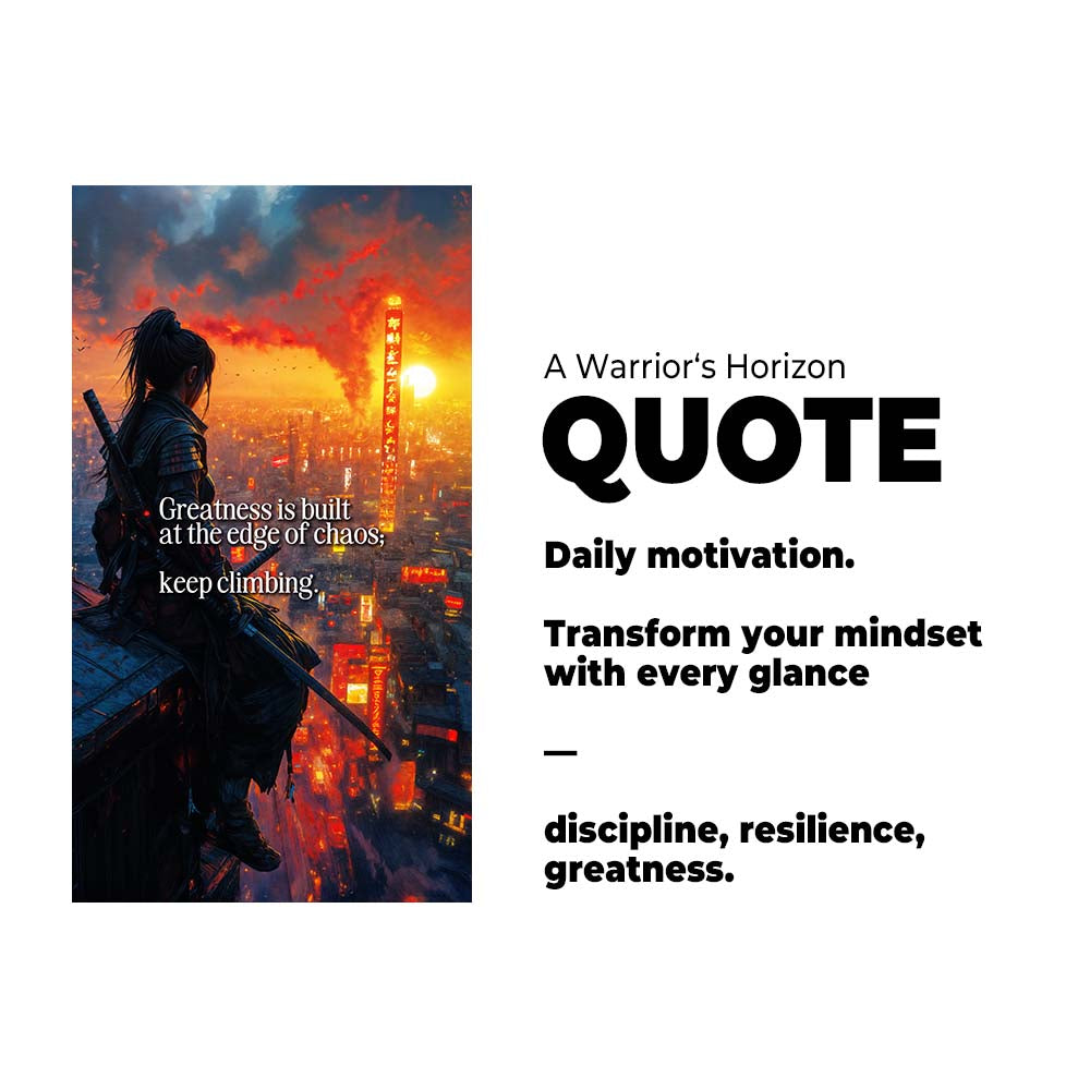 Elevate your mindset with “A Warrior’s Horizon,” a digital masterpiece designed to inspire ambition and focus. Let this stunning artwork serve as a daily reminder of the strength within you—the courage to face chaos and the determination to climb toward greatness.