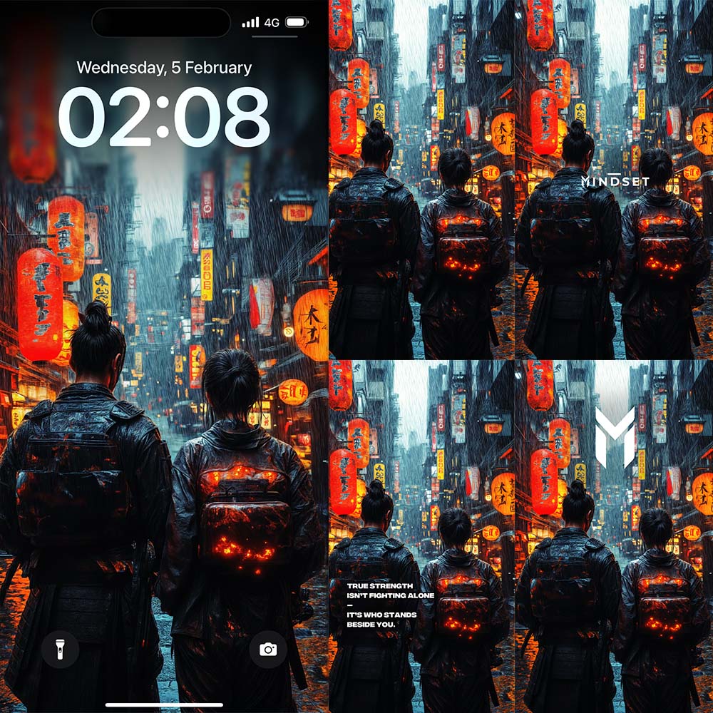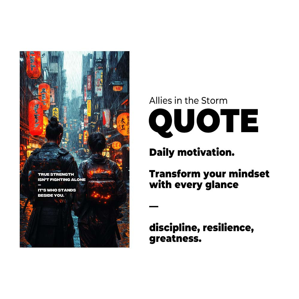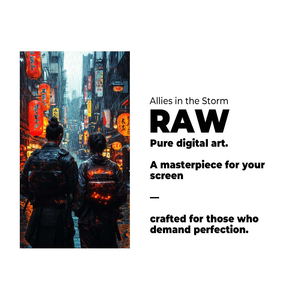 “Allies in the Storm” captures the raw power of unity amidst chaos. Two figures stand together under a relentless downpour, their backs turned to the viewer, yet their presence radiates strength and resilience. The glowing lanterns reflect a fragile yet steadfast light in the storm, mirroring the way bonds of trust illuminate our darkest moments.