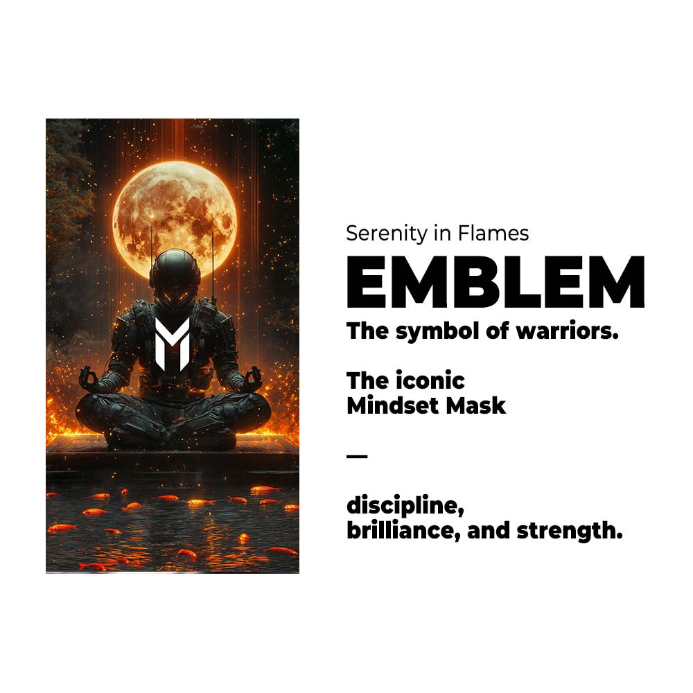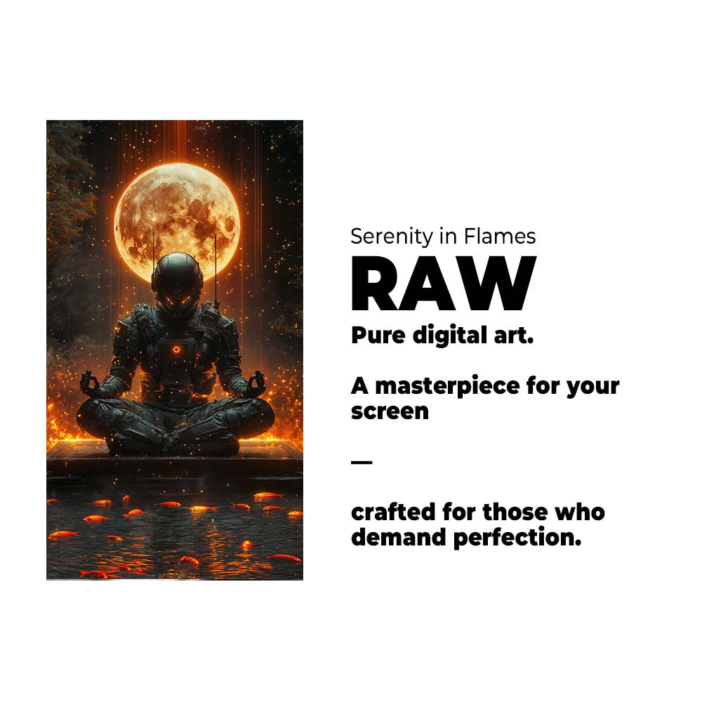 “Serenity in Flames” is a visual embodiment of transformation through chaos. The figure, cloaked in impenetrable steel, meditates amidst flames, a striking symbol of inner peace forged within life’s most intense trials. The blazing inferno is not a threat—it is an ally, a force tamed by resilience and focus. Above, the luminous moon casts its serene glow, contrasting the fire below and representing the harmony between turmoil and tranquility.